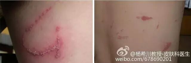 如果清晨起床后,突然发现在身体出现条索状、点状或斑片状水肿性红斑、糜烂、水疱、脓疱(如下图),有明显的瘙痒和灼痛,首先要考虑隐翅虫皮炎。