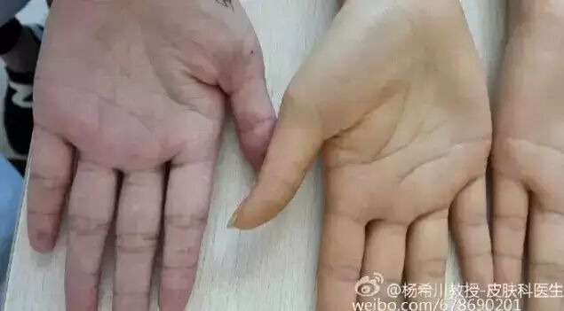 血内胡萝卜素含量过高引起的皮肤黄染。多见于手掌和足跖,有时面部也可以出现,严重者累及全身皮肤,但巩膜不黄染。而肝炎引起的黄疸会有明显的巩膜黄染。