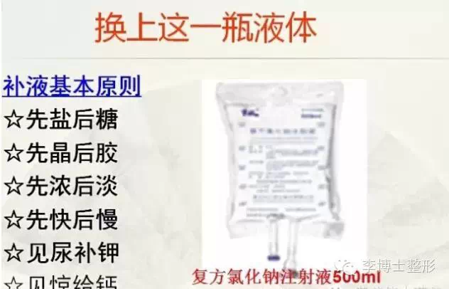 5、快速补充血容量,首选林格液,为此,有必要建立第二条输液通道。可用林格液、低分子右旋糖苷、生理盐水、5%葡萄糖注射液均可,一般先输入500~1000ml,每分钟40-60滴,以后酌情补液,输液速度不宜过快,量不宜过多,以免诱发急性肺水肿。