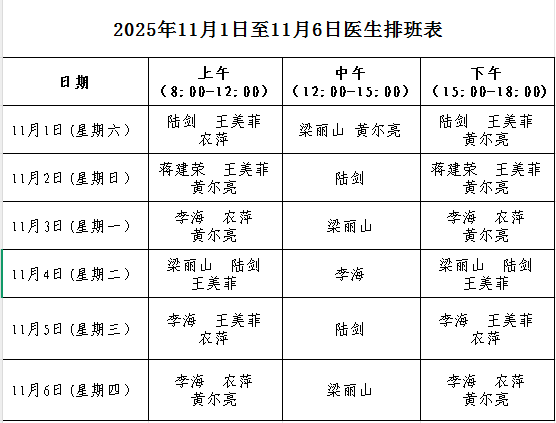 2025年11月1日至11月6日医生排班表