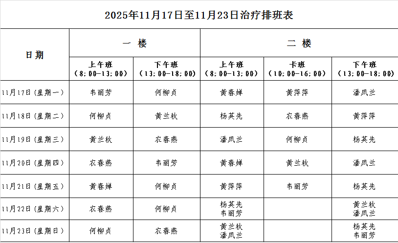 2025年11月17日至11月23日治疗排班表