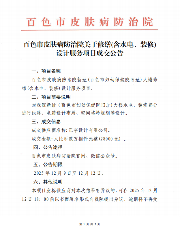 百色市皮肤病防治院关于修缮(含水电、装修)设计服务项目成交公告