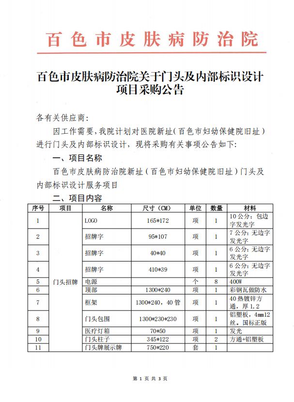 百色市皮肤病防治院关于门头及内部标识设计项目采购公告