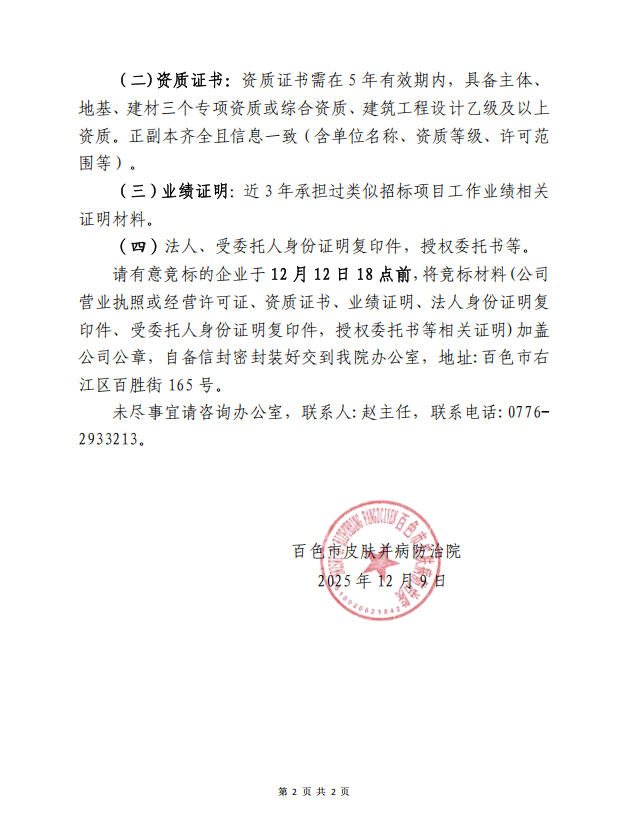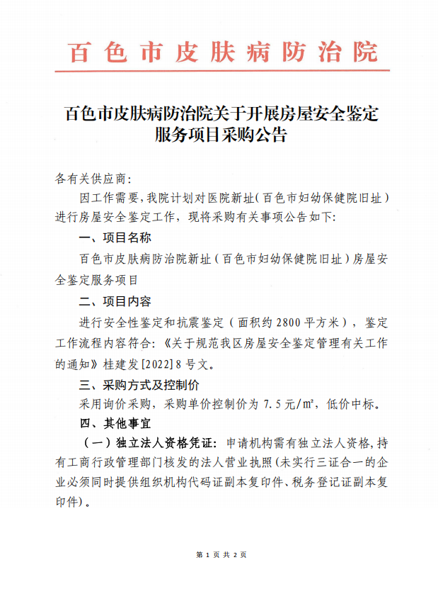 百色市皮肤病防治院关于开展房屋安全鉴定服务项目采购公告