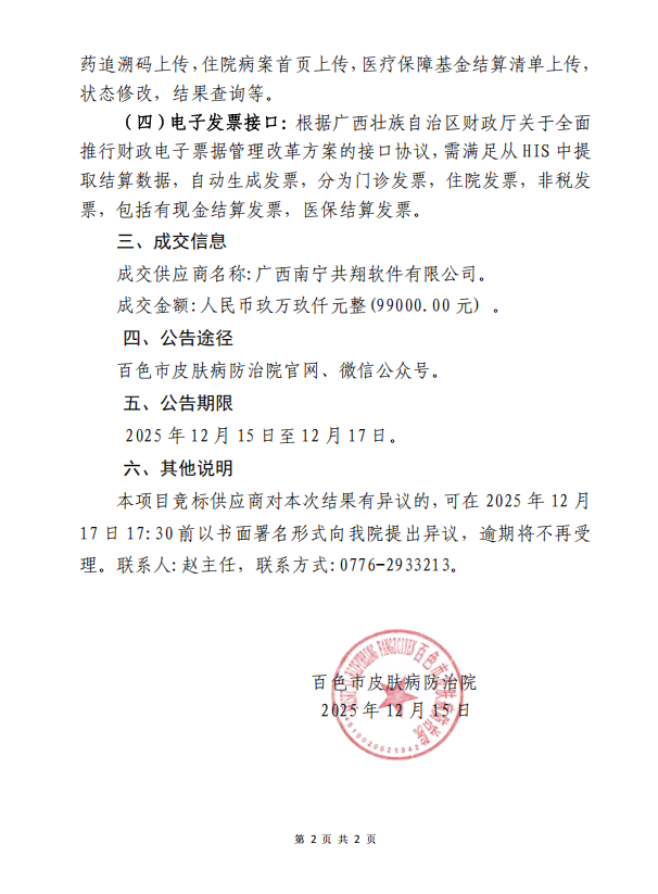 百色市皮肤病防治院关于 HIS 系统软件模块增设项目成交公告