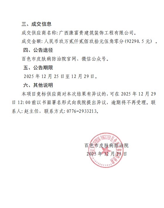 百色市皮肤病防治院关于检验科室内装修项目成交公告