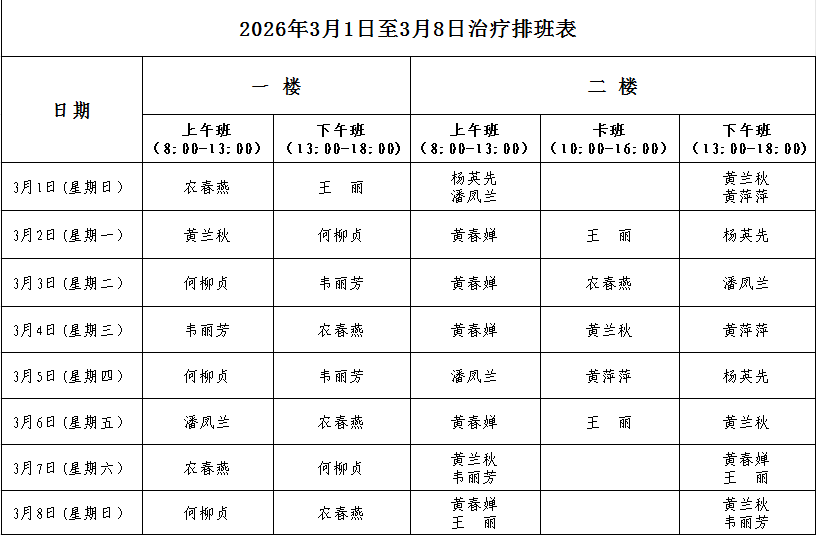 2026年3月1日至3月8日治疗排班表